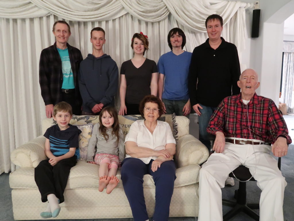 Beginning very early Sunday morning, November 18, Varrin, Mark, and Mom were up helping care for Dad. Although he was aware and communicative, his ability to do anything at all physically, even change positions on the couch, was declining noticeably hour by hour. At breakfast time, we decided to have each of the grandchildren come one at a time to say any final thoughts while Dad sat on the couch. He heard, understood, and said a few words of acknowledgment and thanks to each one before they made their way to the breakfast table. Much to the surprise of all of us, he then asked to join us at the table for breakfast, which we all greatly enjoyed, including Dad.