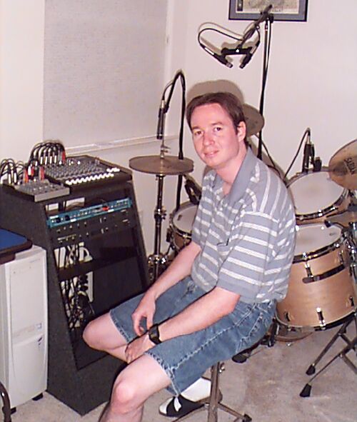 I began working on putting together a home recording studio in late 1999. The plan I came up with was executed in early 2000 and I now have the ability to do reasonably good quality recording right here in my own home. Here is a picture of me sitting at my drums in the studio: